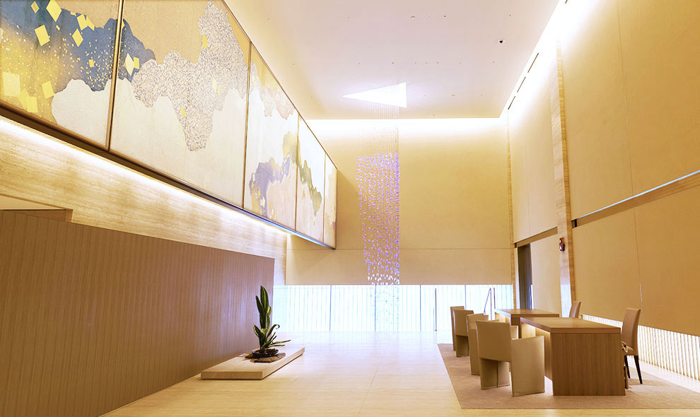 在建筑设计大师谷口吉生费尽心血逼真复原的新颐馆大堂里,有象征大仓的“大仓灯笼”,有拼成满开梅花形状的漆器桌椅,有显示六大陆代表城市时刻的“世界时钟”,还有延续了原大仓主楼光辉的纸灯为新大堂画龙点睛。